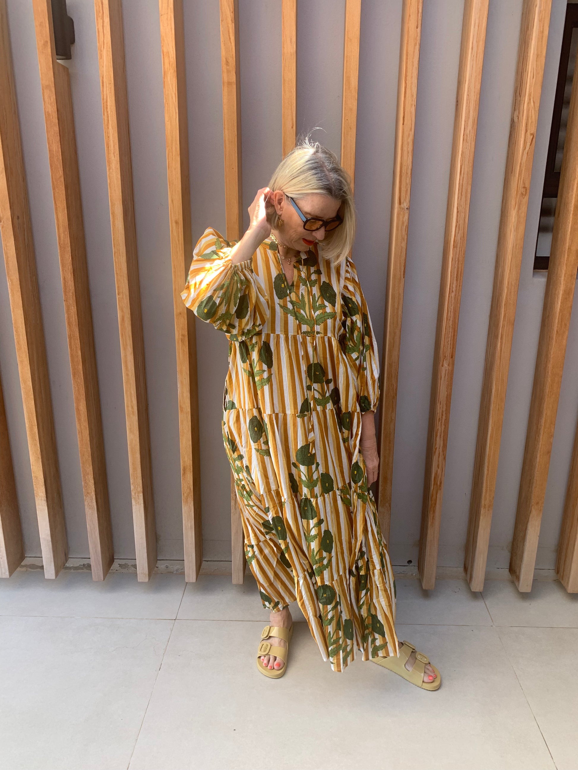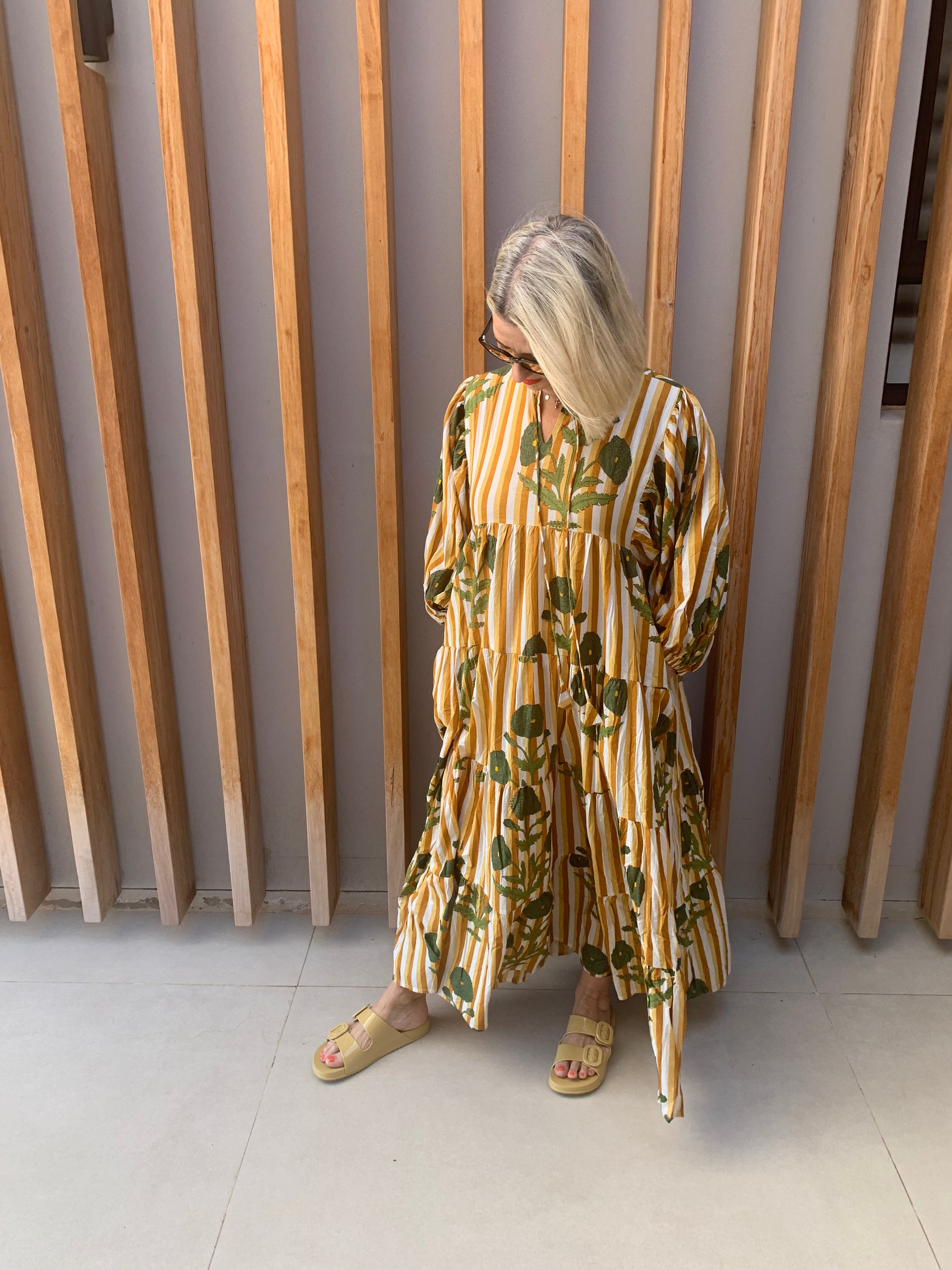 Beige, bronze & white vertical striped dress with green poppies pattern. Long dress with long balloon sleeves and pockets. Manufactured using 100% Indian cotton. Model wearing free size.