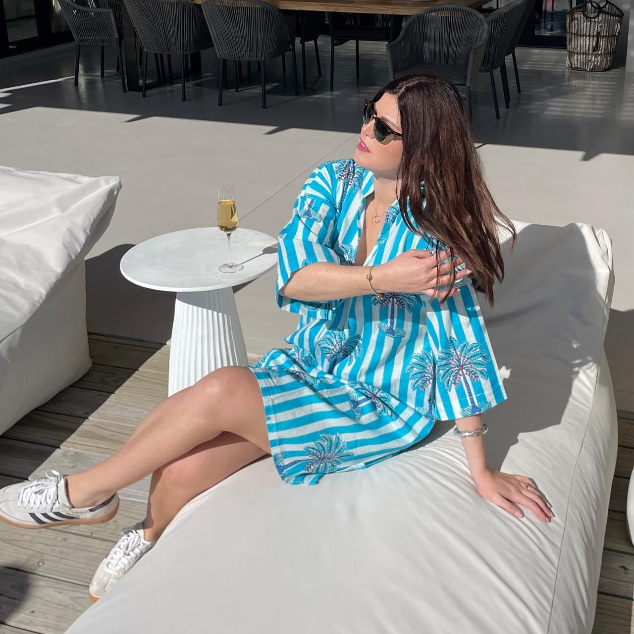 Blue & white striped dress with floral palm pattern. Knee length & 3/4 sleeves with pockets. Manufactured from 100% Indian cotton. Model wearing size XS.