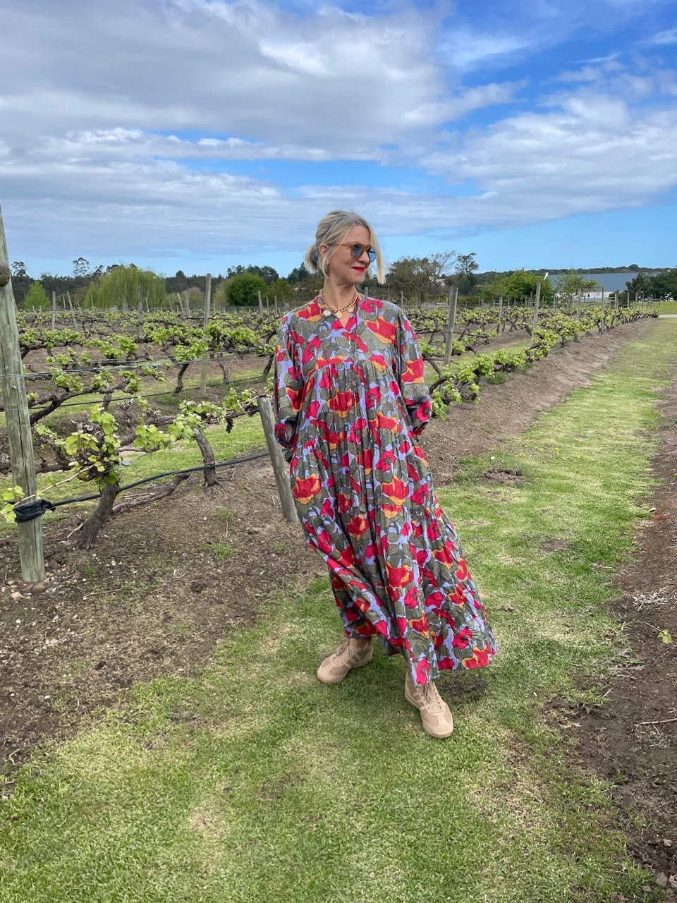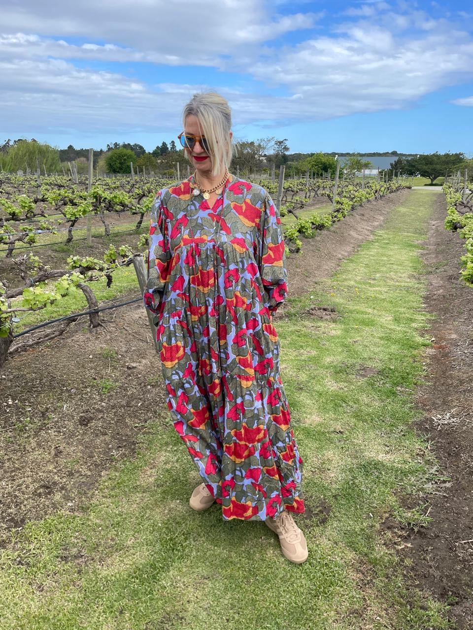 Red & olive green dress. Long dress with long puffy sleeves and pockets. Manufactured using 100% Indian cotton. Model wearing "free size"