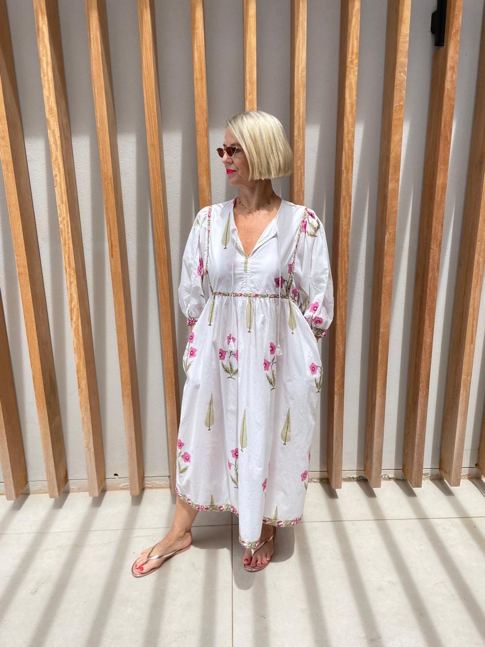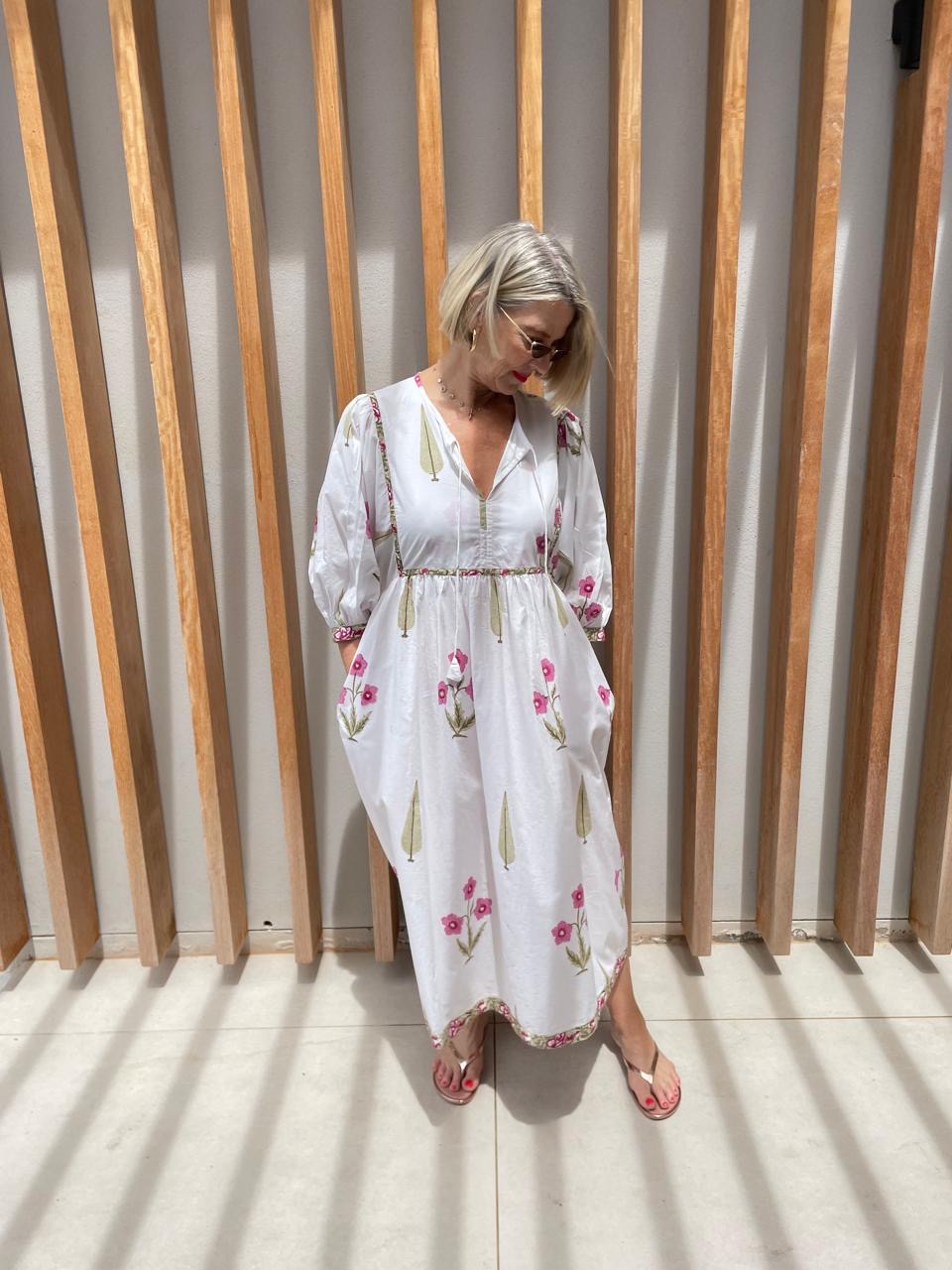 White dress with red & green flower pattern. Long dress with long puffy sleeves and pockets. Manufactured using 100% Indian cotton. Model wearing size S.