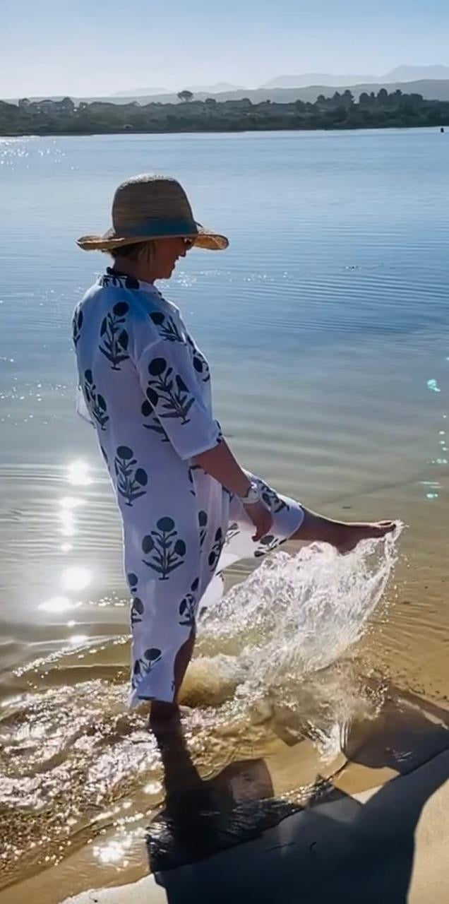 White dress with grey poppies floral pattern. Long dress with short sleeves and pockets. Manufactured using 100% Indian cotton. Model wearing size S.